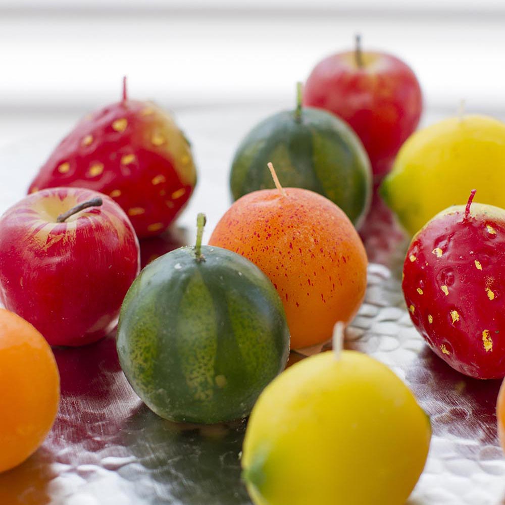 Set por 12 velas en forma de frutas, manzanas, naranjas, lima, limón, frutillas.