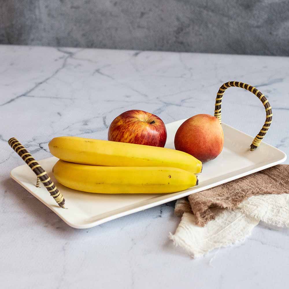 Bandeja de cerámica blanca con manijas de bamboo. 33x21cm.