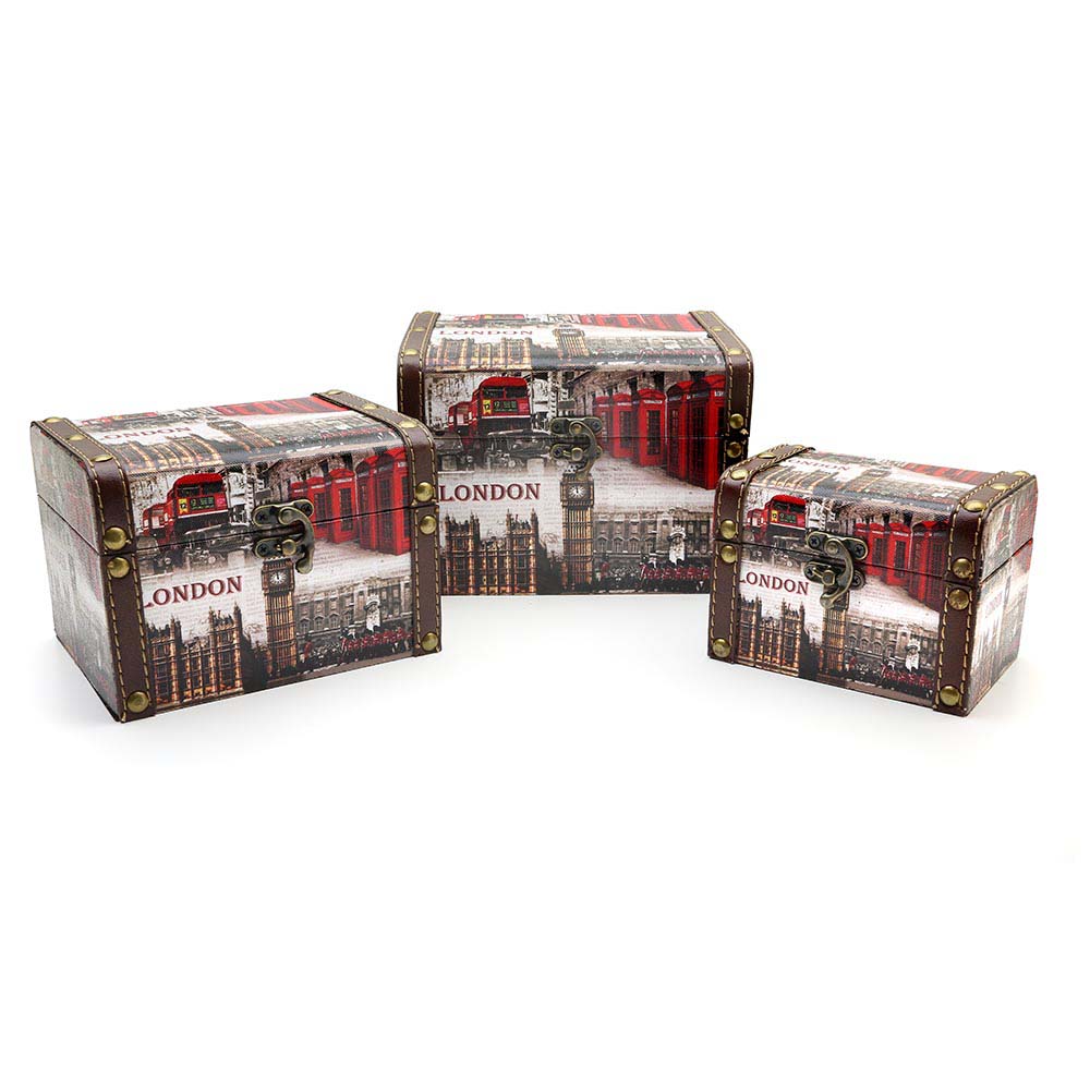 Set de 3 cajas de madera con diseño de ciudad.