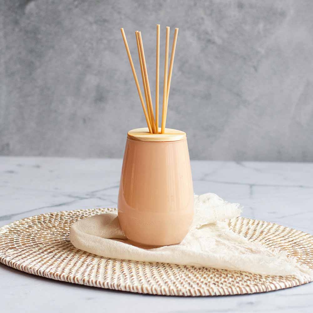 Difusor de vidrio en color rosa con tapa de madera.