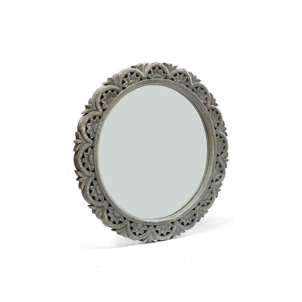 Espejo circular con borde en madera calada gris de 76cm de diámetro.