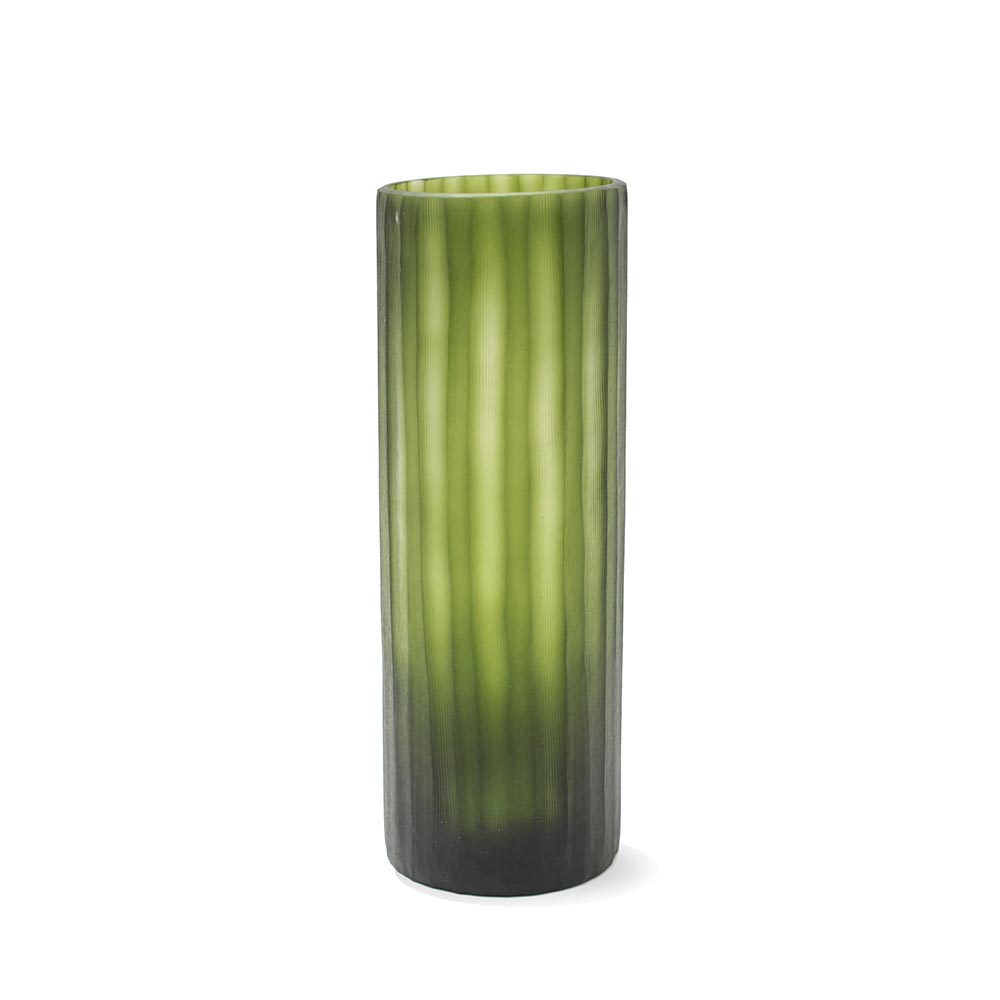 Jarrón de vidrio texturado verde de 35cm x 12cm.
