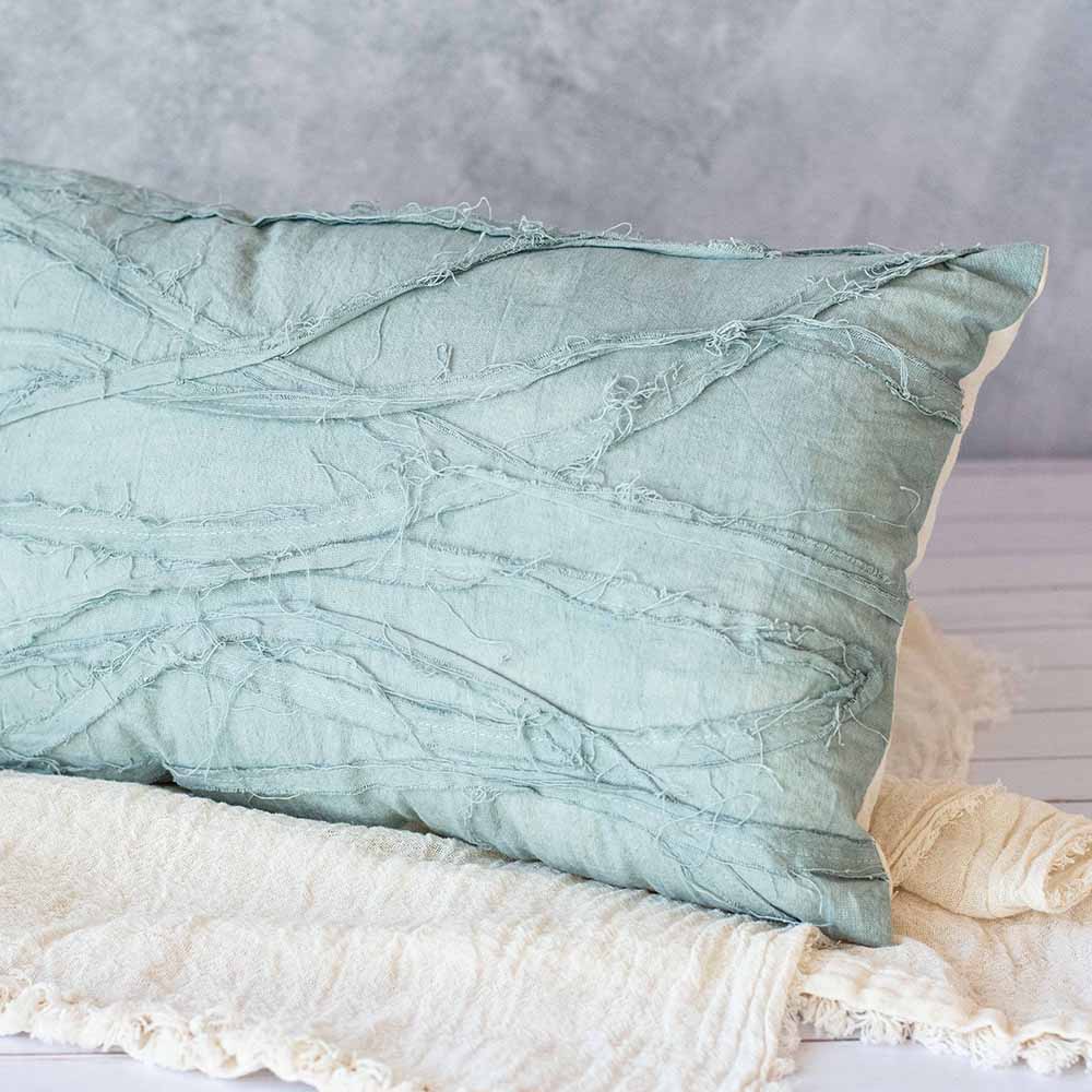 Almohadón de lino en color verde con hilachas de 50x30cm