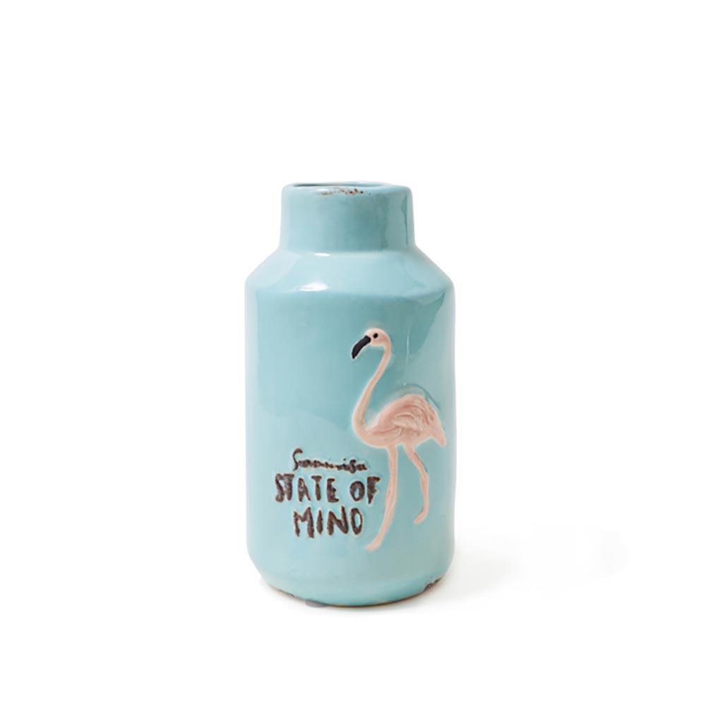 Jarrón de cerámica celeste de 22cm con imagen de flamenco e inscripciones