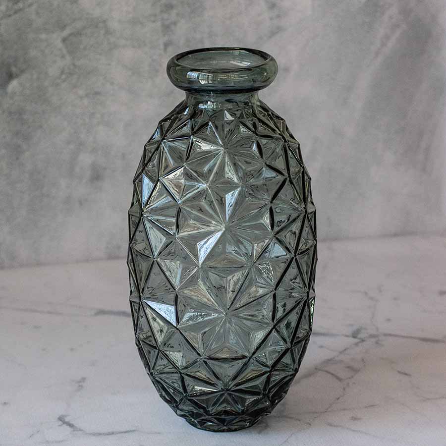 Jarrón de vidrio labrado en color gris de 39x16cm.