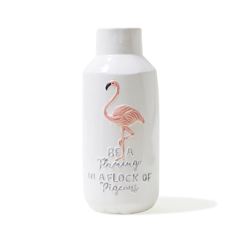 Jarrón de cerámica blanca de 33cm con imagen de flamenco e inscripciones.