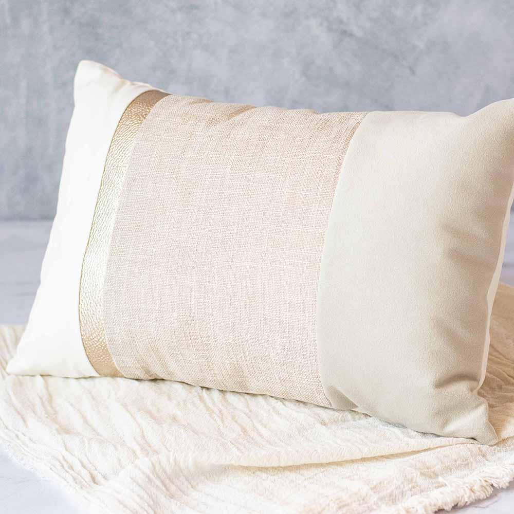 Almohadón de 50x30cm combinado de telas en crudo y oro