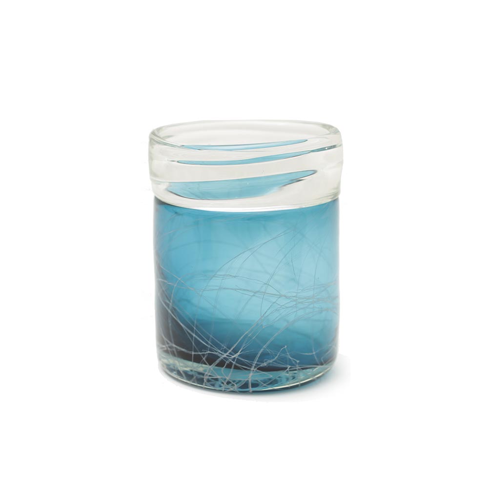Jarrón de vidrio azul de 16.5cm x 13cm.