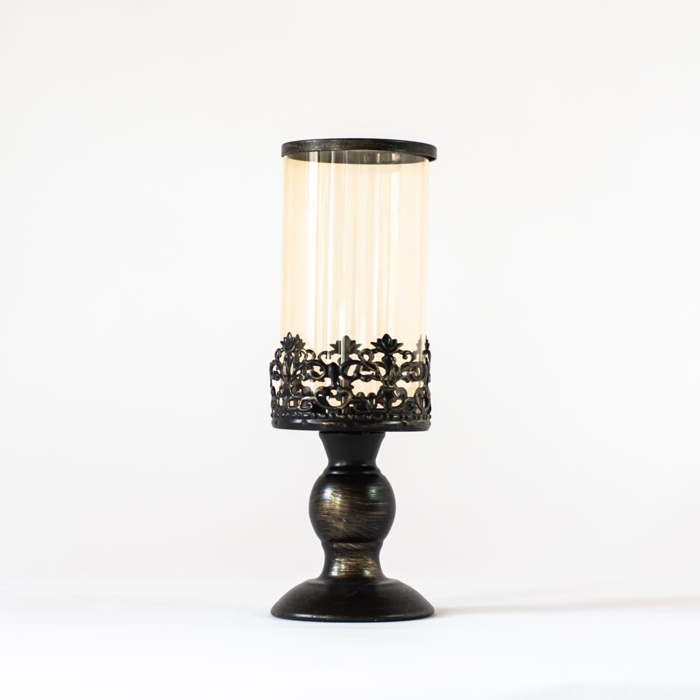 Porta vela de metal en color marrón oscuro y vidrio. Medidas 30 x9,5cm.