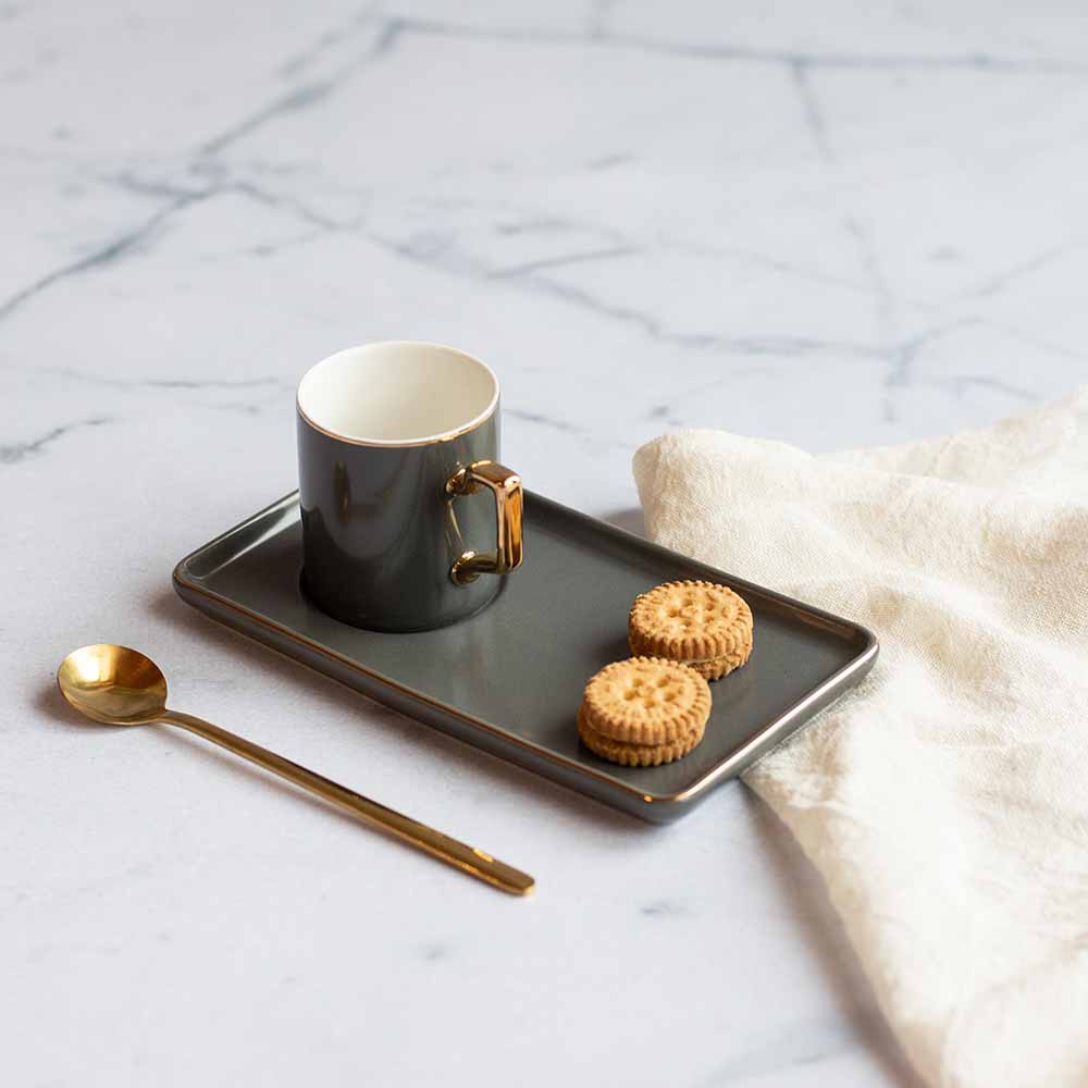 Set por 6 taza y bandeja de cerámica gris. 17,5x7cm