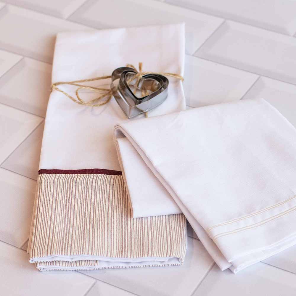 Set de 2 toallas de cocina blancas con zocalo con estampa rayada bordo y natural con accesorios.